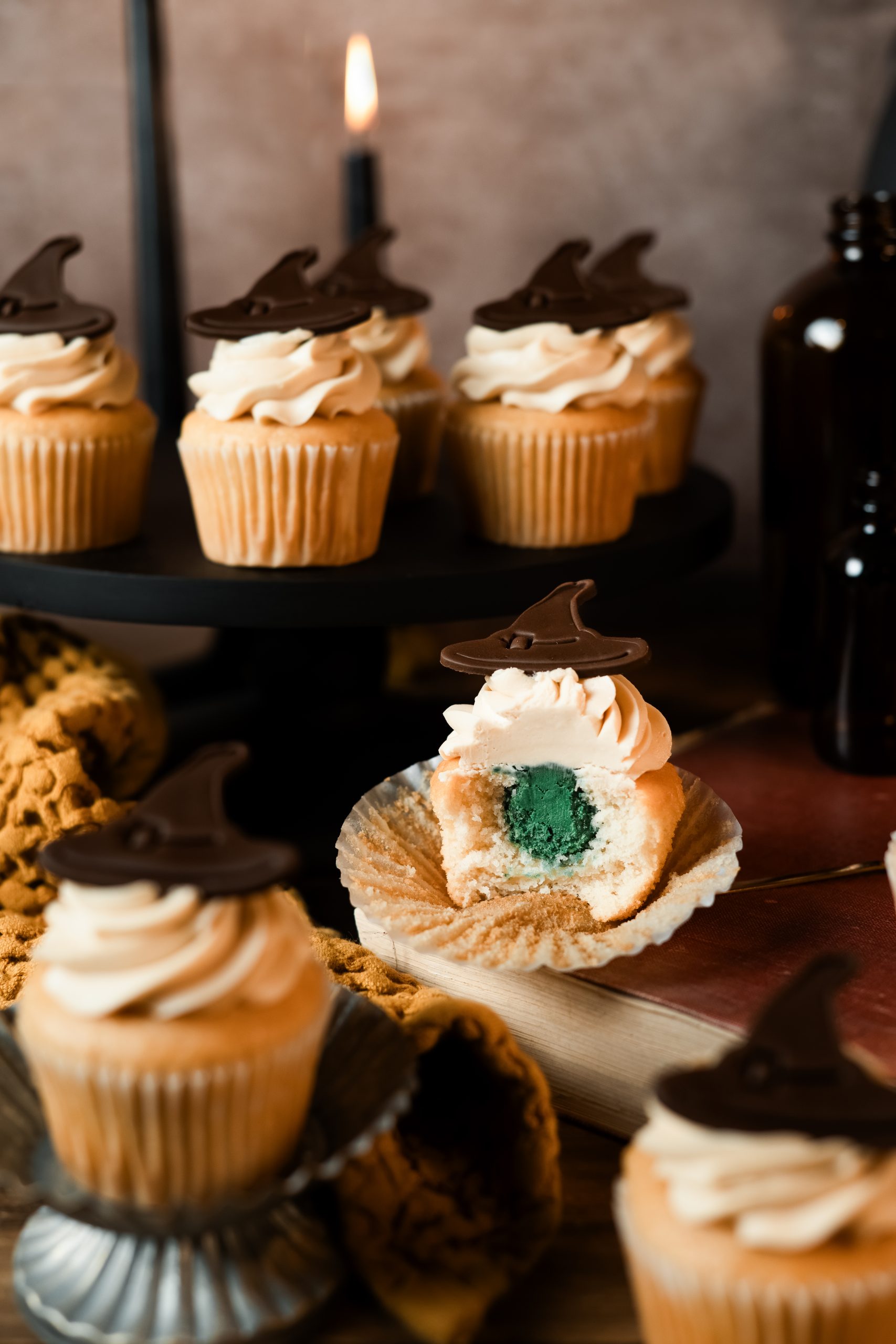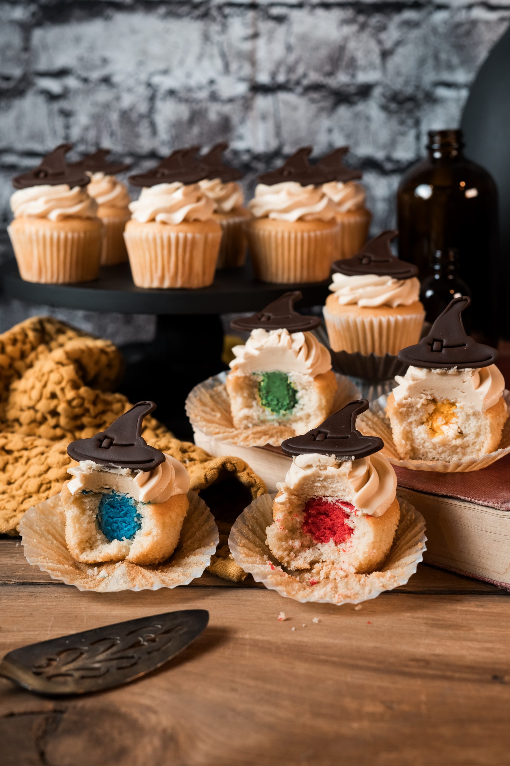One dozen delicious butterbeer cupcakes. A butterscotch cake with salted caramel buttercream, filled with house colors and topped with a sorting hat!