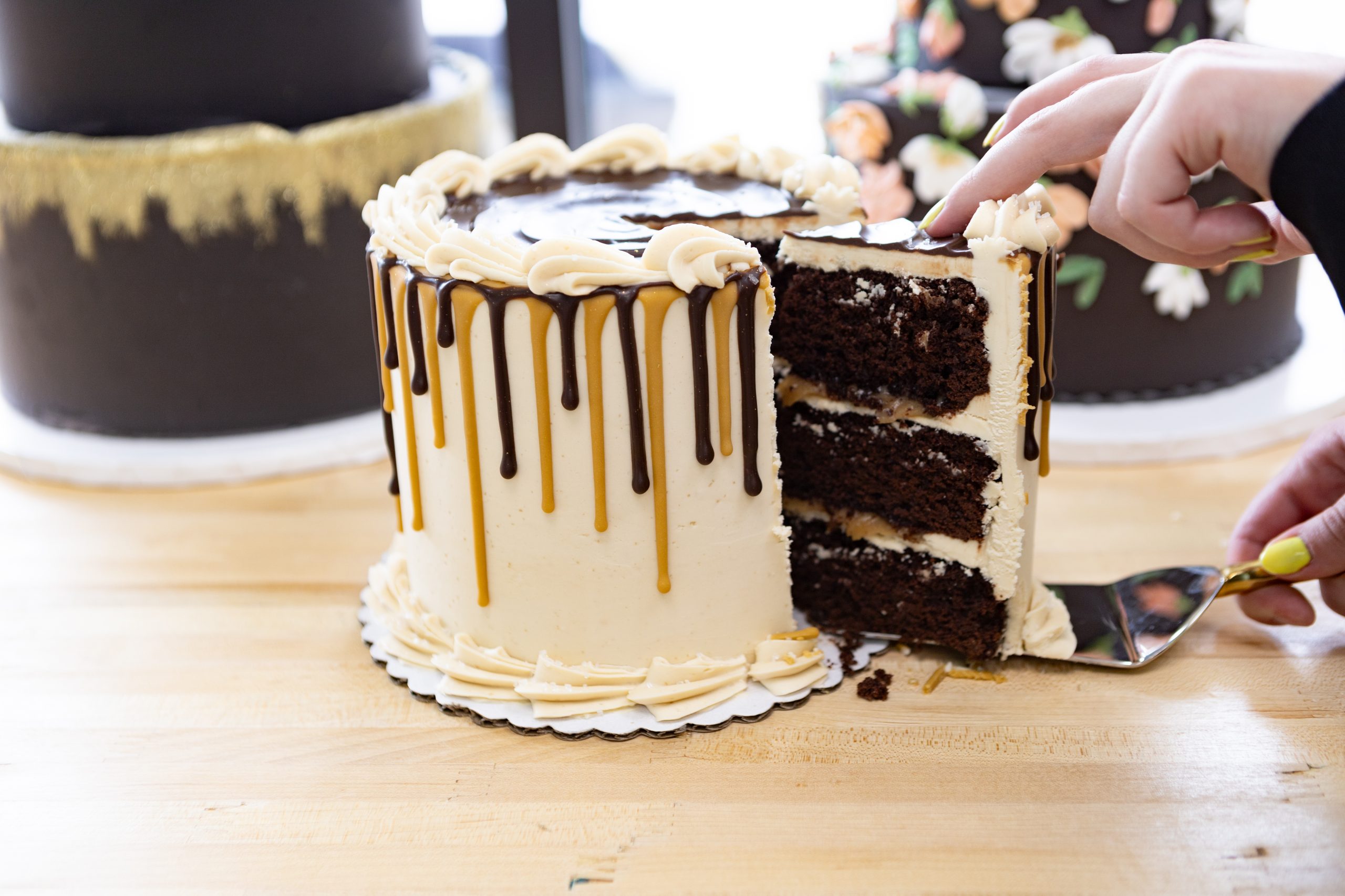 German Chocolate – Belgian chocolate cake with our homemade caramel coconut pecan filling and chocolate buttercream and more caramel coconut pecan filling.