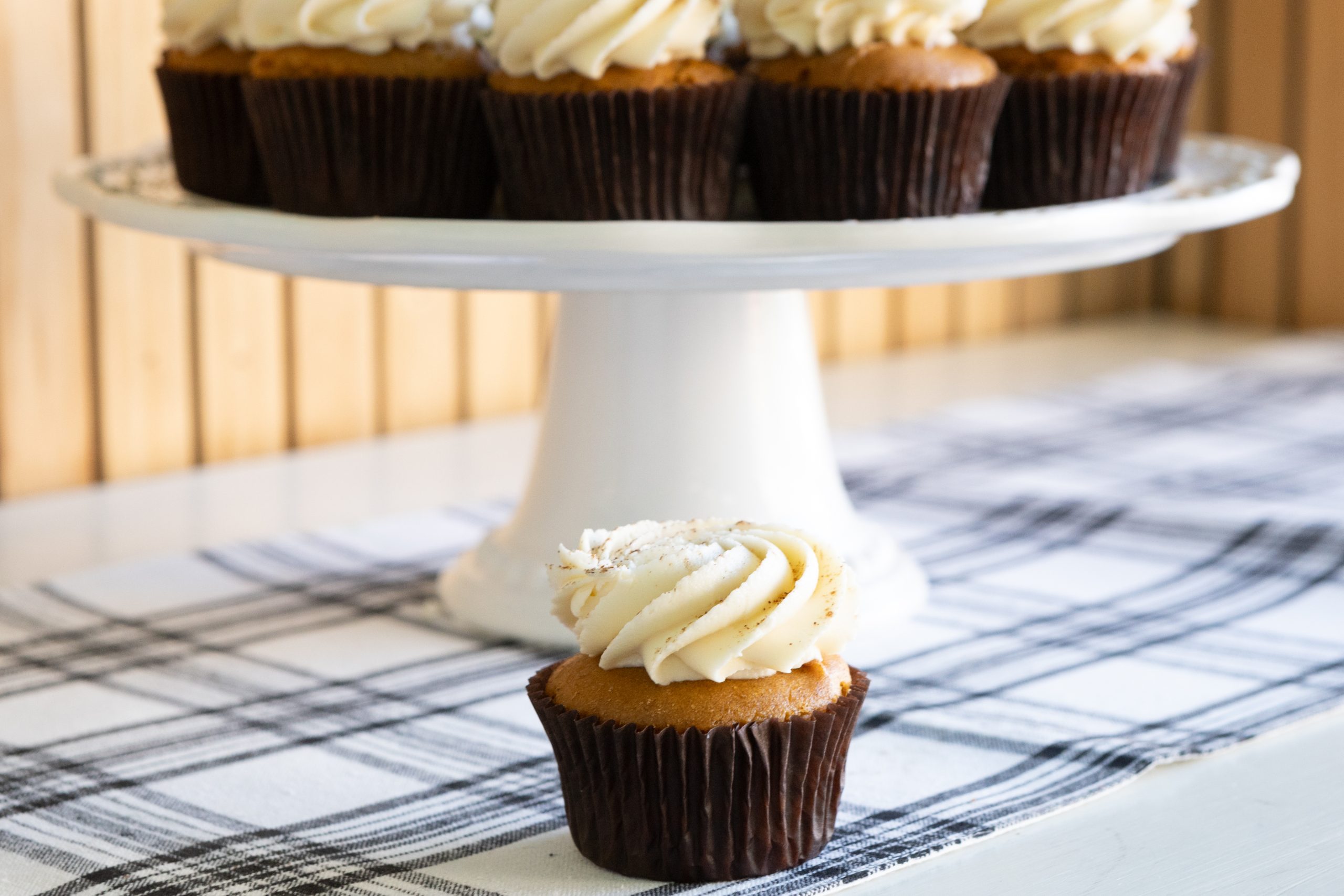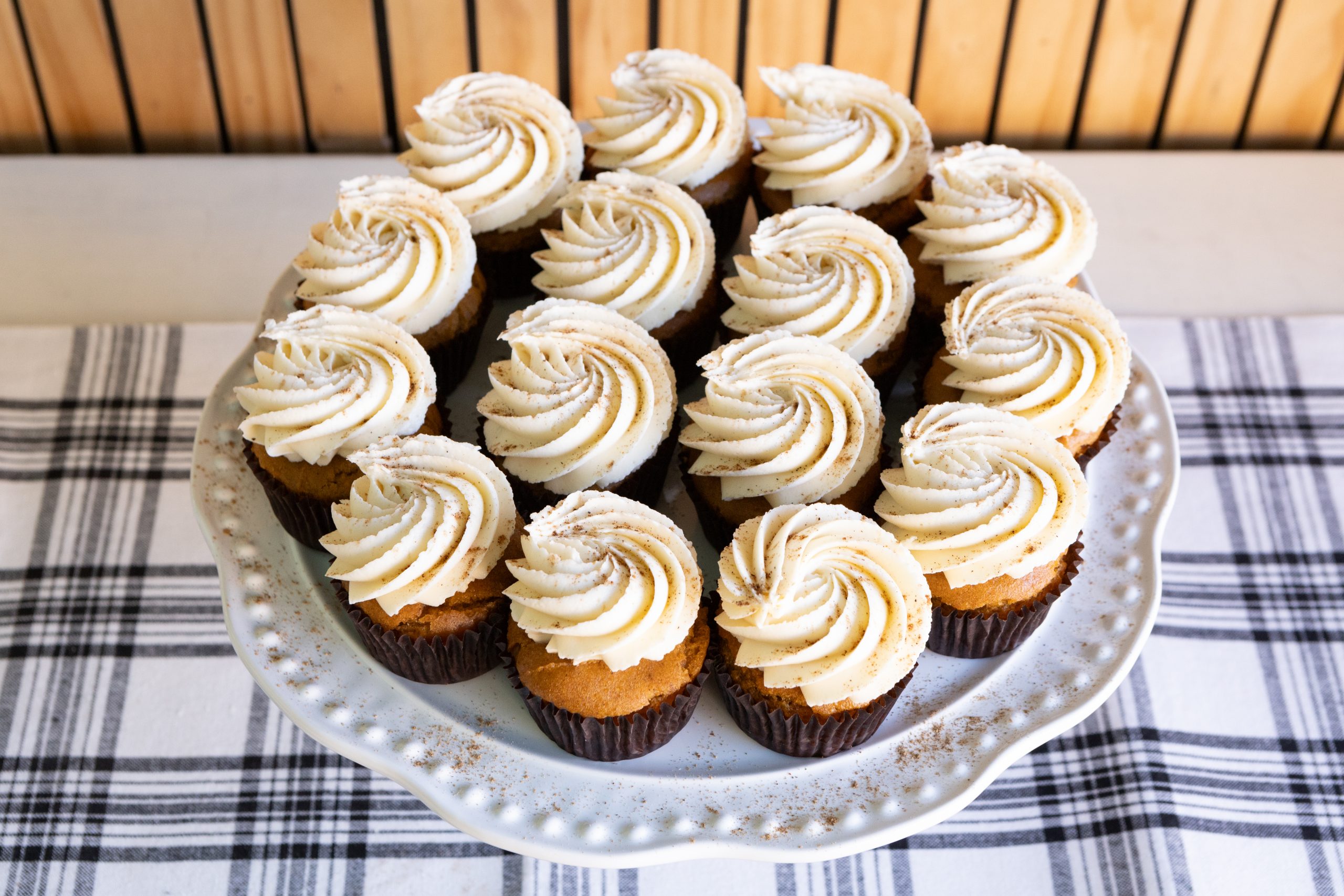 One dozen gluten free and vegan pumpkin spice cupcakes topped with a vegan vanilla buttercream