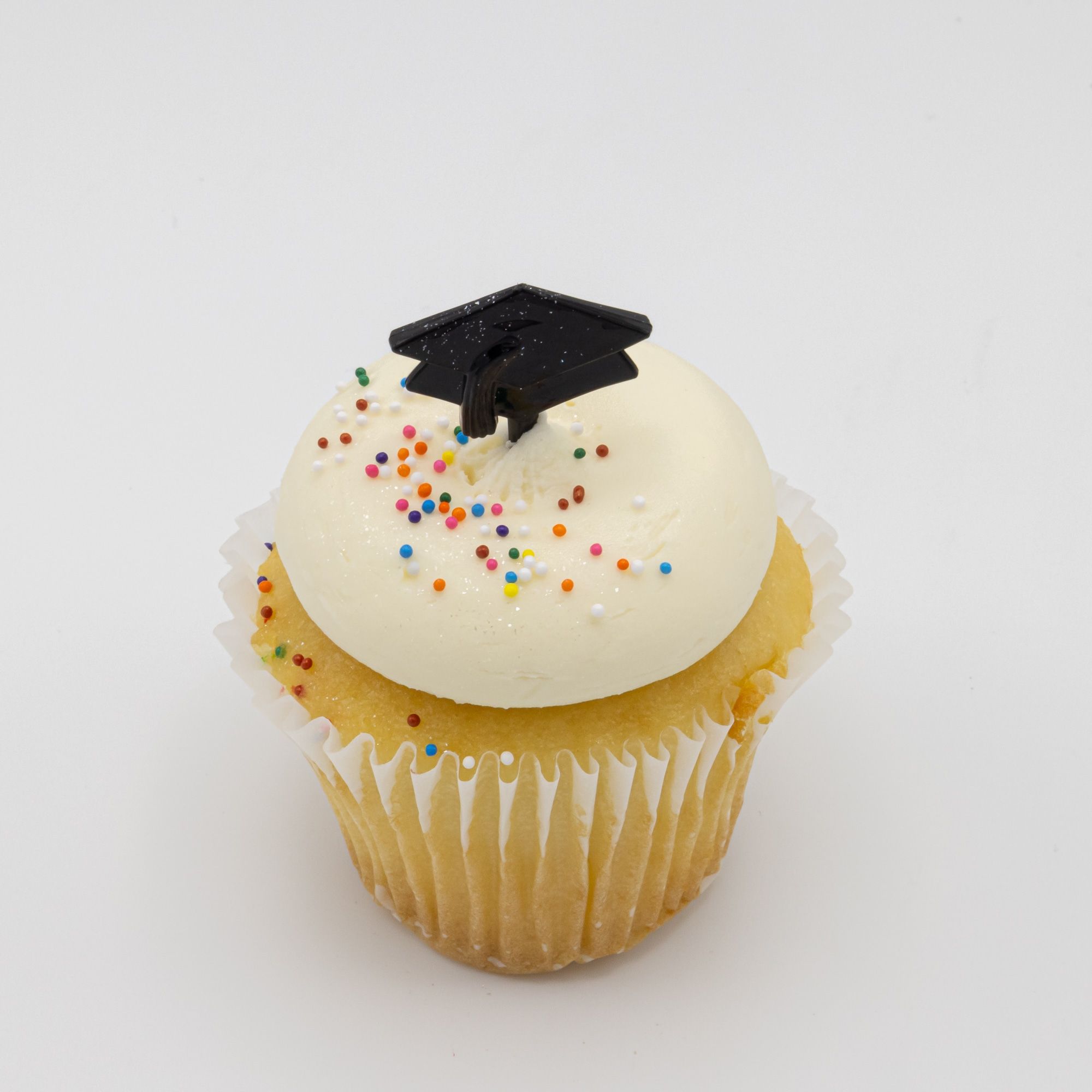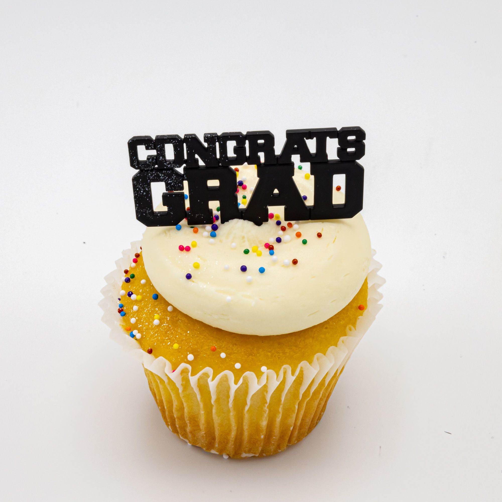 Congratulations! These grad cupcakes are the perfect treat to celebrate graduation. Comes with either a “congrats grad” or Grad Cap topper. Comes with vanilla cupcake, and vanilla buttercream. You can specify sprinkle colors in the notes section at checkout.