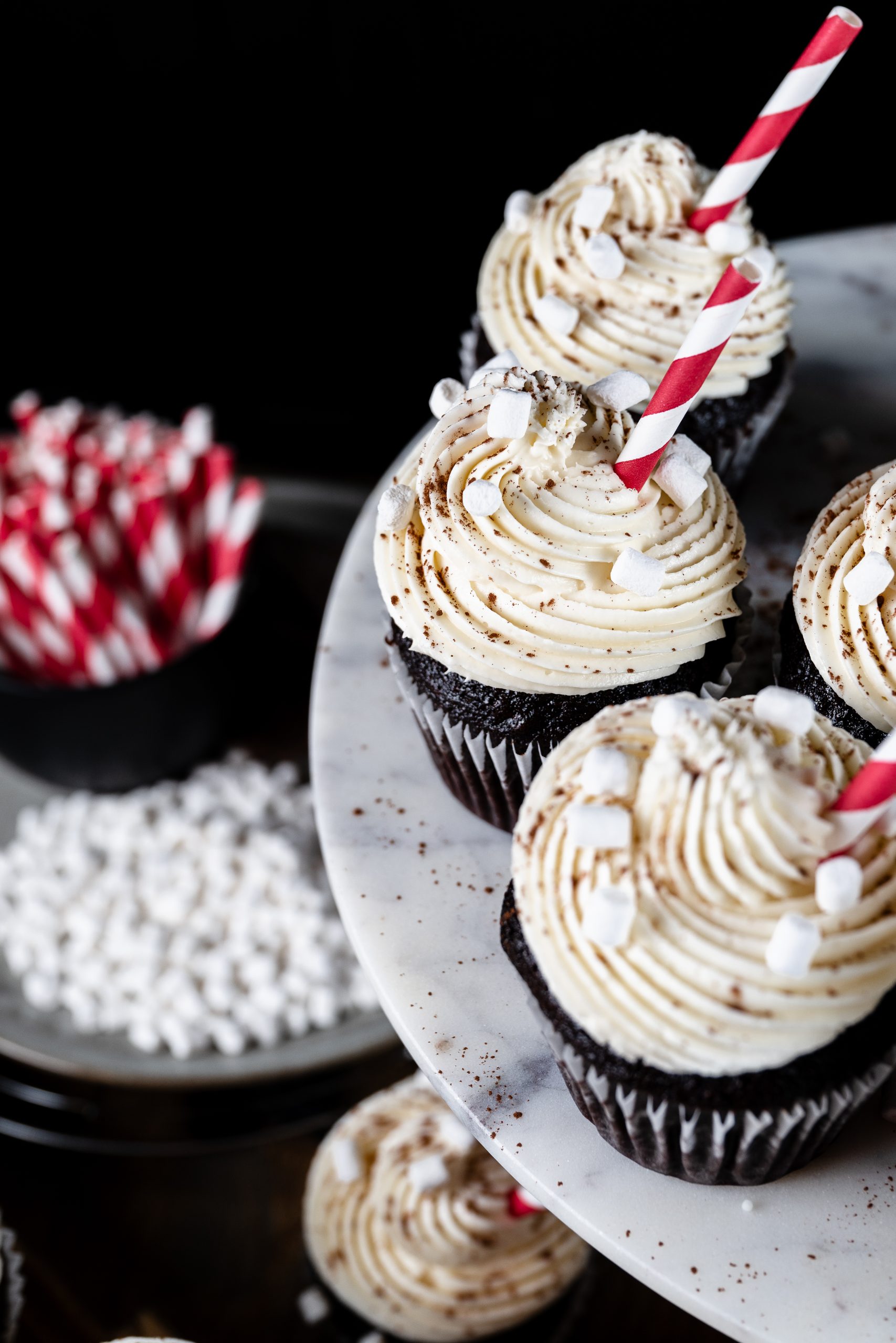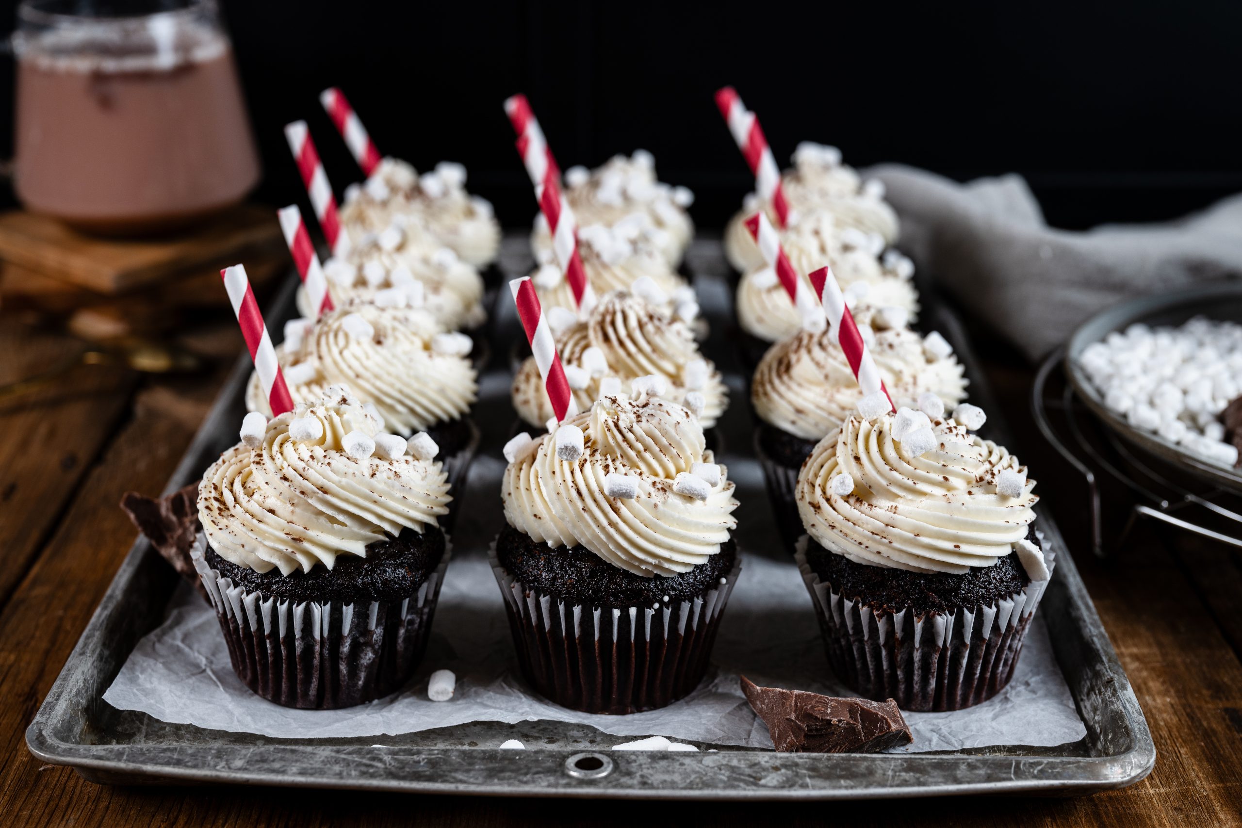Warm up your taste buds with our indulgent Hot Cocoa Cupcakes! This decadent dessert features rich, moist chocolate cake filled with smooth chocolate ganache, then topped with fluffy marshmallow buttercream. Each cupcake is finished with a light cocoa dusting, mini marshmallows, and a festive red-and-white striped straw — just like your favorite cup of hot cocoa, in cupcake form!