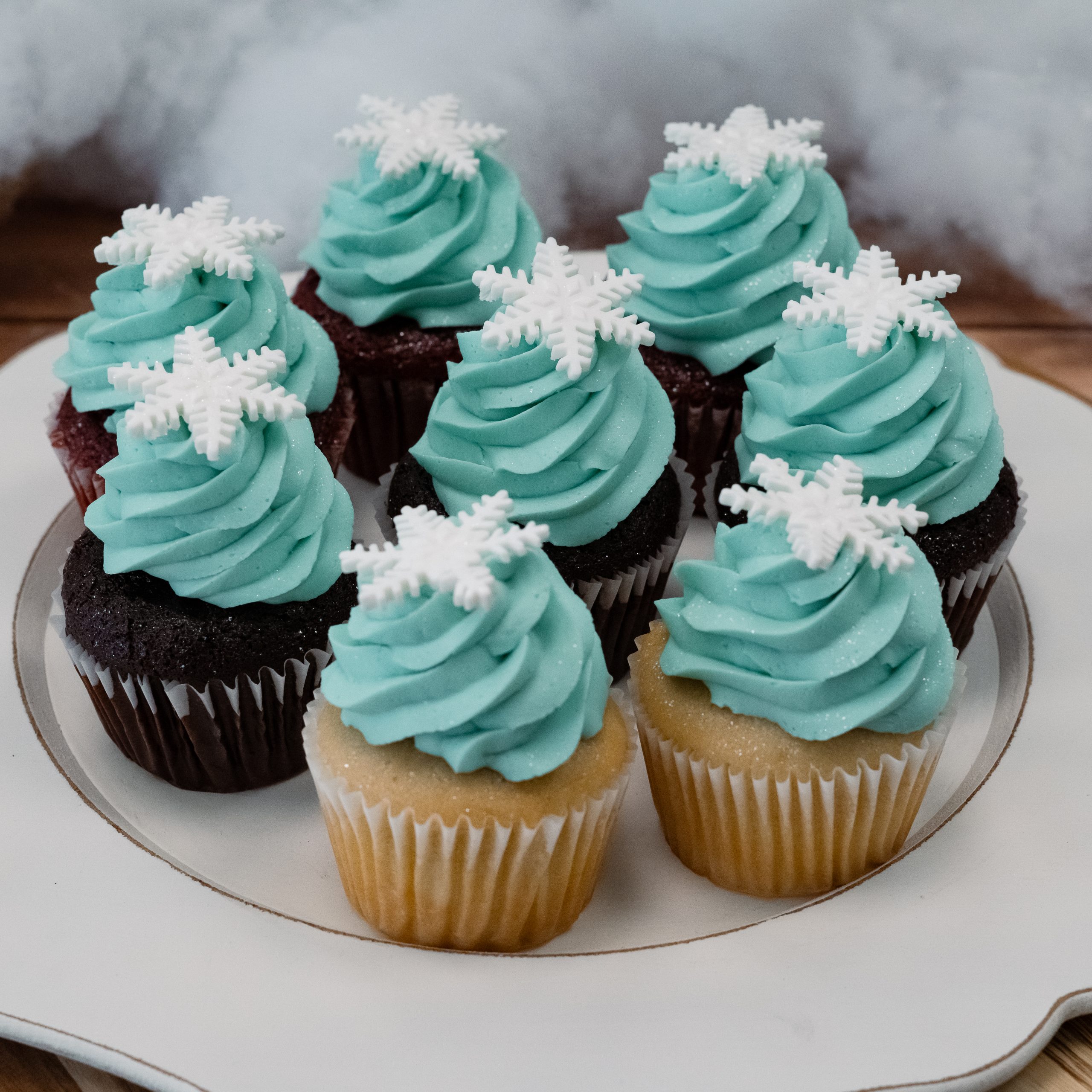 Cute cupcakes with an icy blue vanilla buttercream, and snowflake toppers!