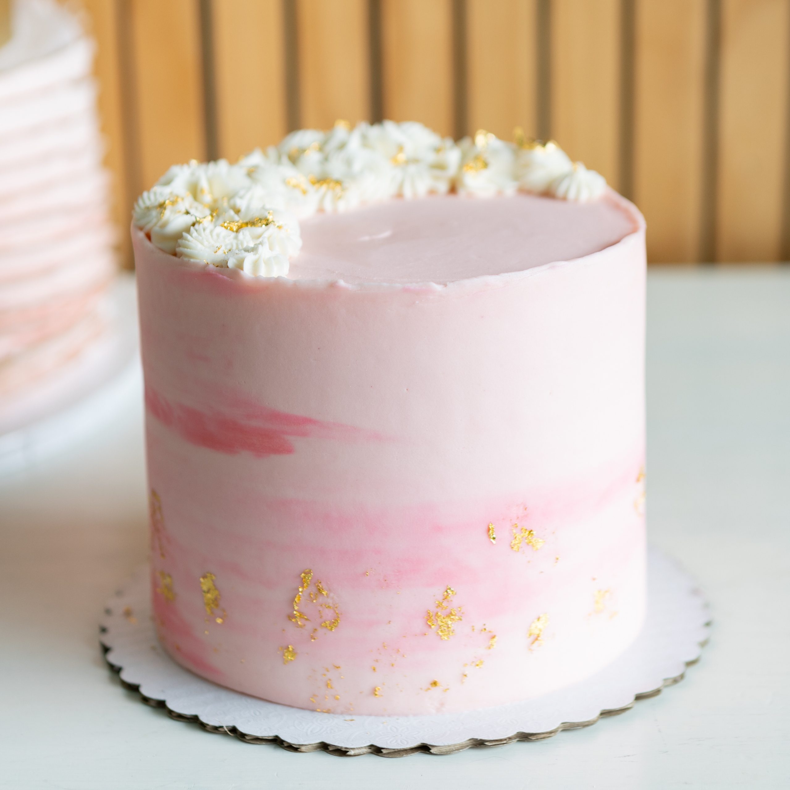 A light strawberry champagne cake made with strawberries and real strawberry champagne, with out house made strawberry puree between the layers, iced in strawberry champagne buttercream. Accented with real 24k gold leaf!