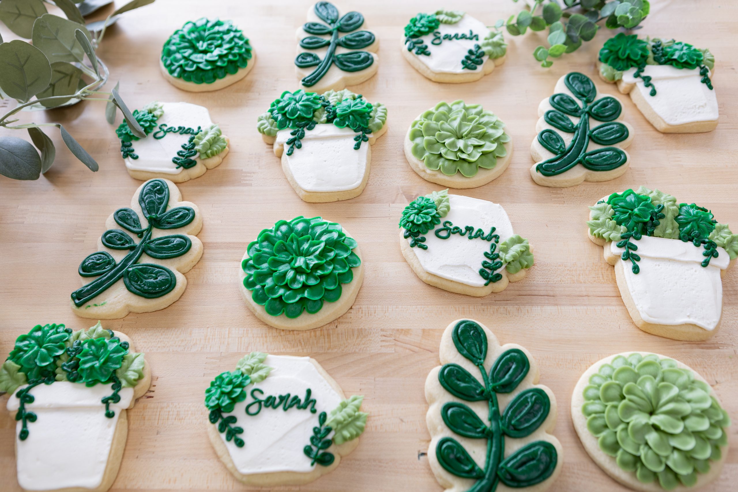 Set of one dozen buttercream iced sugar cookies decorated as charming succulents. Great for bridal showers or birthdays!