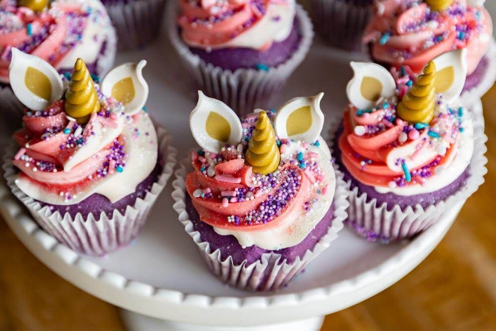 One dozen vanilla unicorn cupcakes with a raspberry swirled cream cheese buttercream, decorated as a unicorn with lots of glitter and sprinkles!